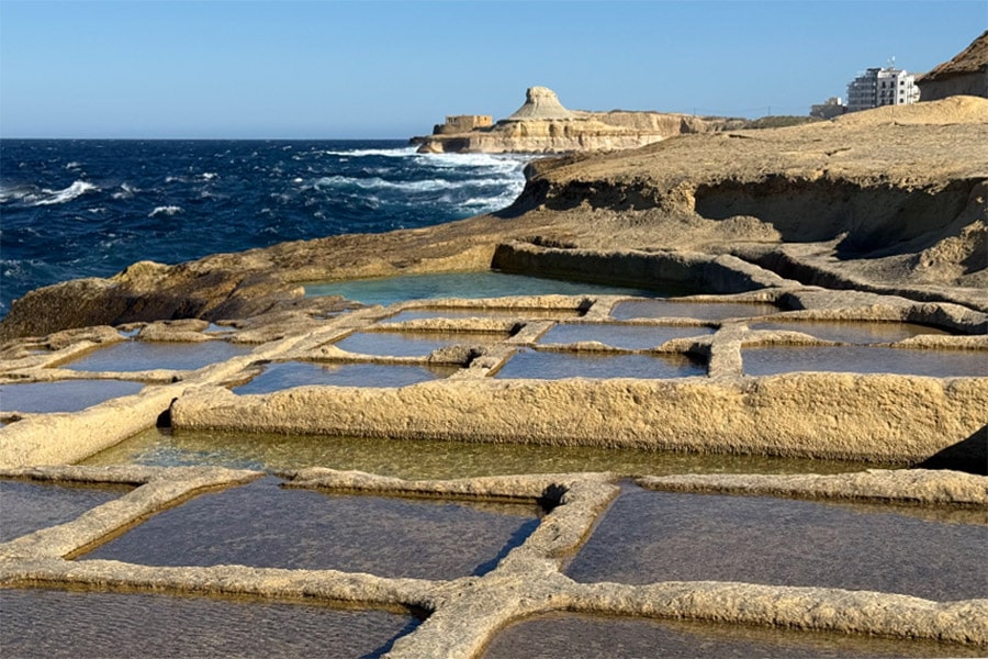 About a mile from the beach where Paul came ashore lies the center of Malta’s medieval salt production. By 1650, Malta had become a salt exporter. The Knights constructed a large salt production system made up of wide, shallow rock pans that drew in seawater. Sun and wind evaporated the water, leaving behind crystallized salt in the briny pools.